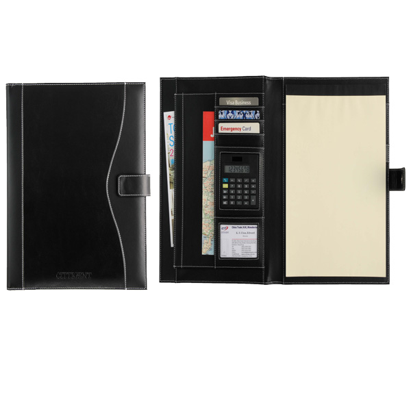 inner with dcoument holder ,card pocket,pen loop ,calculator and A4 standard notepad,clear ID window with square calculator |