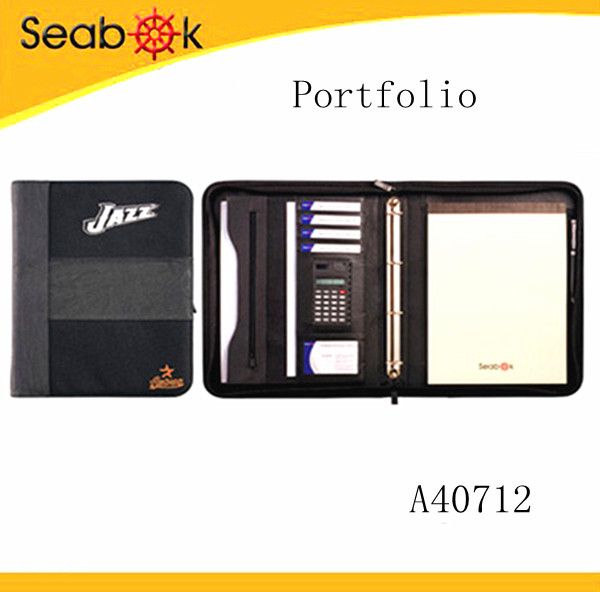 4. Detail: Portfolio documents, A4-shape with inner pockets for business cards and magazines,with note-pad and pen loop,4 ring binder, 8 digits dual power calculator with ruler.zipper closure. |