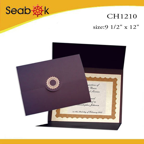 | CH1210 1)Item number:CF1210 2)Materiall:paper 3)Color: purple,other colors are available 4)Folding fashion folder for certificate 5)Customized size and style are welcome 6)Wholesale service with competitive price 7)Logo can be printed as you need 8)Widely use in school for certificate papers |