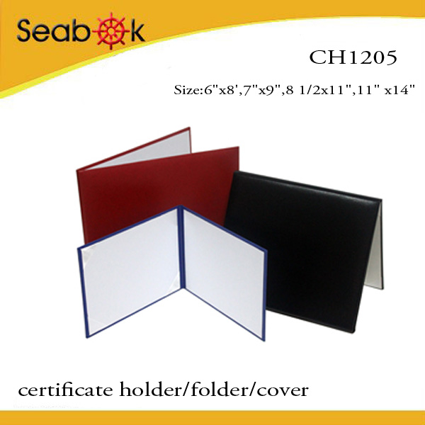 | CH1205 1)Item number:CF1205 2)Materiall:light leatherette cover + Foam padding+ chipboard+ cardstock 3)Color: black ,blue,dark blue,other colors are available 4)Folding fashion folder for certificate 5)Customized size and style are welcome 6)Wholesale service with competitive price 7)Logo can be printed as you need 8)Widely use in school for certificate papers |