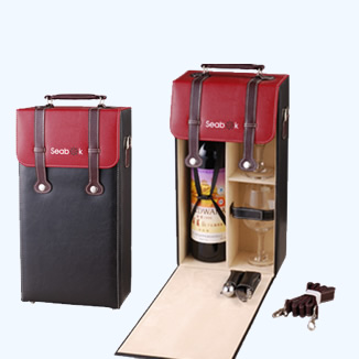 A belt outside the wine box,astopple and a corkscrew inside button closure.
