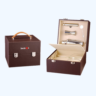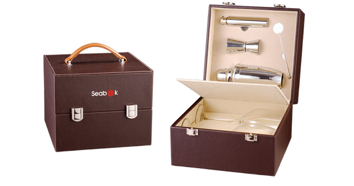 One the front there are two locks and winth handle,inner there are two layers,the fist layer on the top there is a wine vassal ,measruing cup,wine stick,wine bottle.
