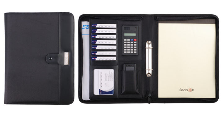 5.Feature:The folder with document pockets ,business card,fake solar calcultor and phone pouch on the open left, 2 ring binder in the center,a pad pocket,20sheets of 60g pad on the open right .