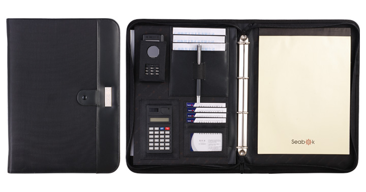 5.Featuer:The portfolio with file pocket , card holders , phone pouch and calcultor on the left inside, 4-ring binder in the center , pad pocket and notepad on the right inside.