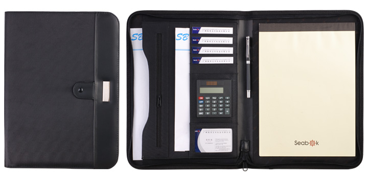 5.Feature:The file holder with document pocket ,card holder,calculator on left inside ,pen loop in the center,pad pocket and notepad on right inside