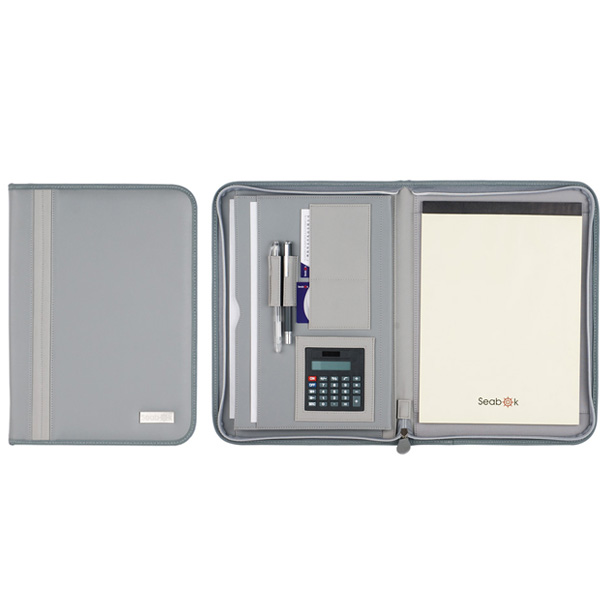 4..Feature: A4 shape Portfolio with file pocket,square caculator ,business card pocket ,two pen loops and knotepad pocket .zipper closure