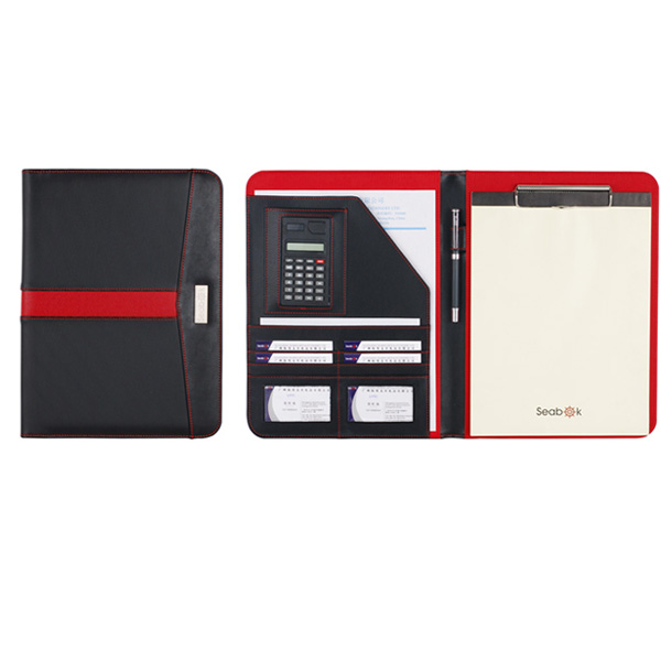 4..Feature: A4 shape Portfolio with file pocket,interior organizer with business card pocket,window pockets,5"calculator,pen loop and metal clip.