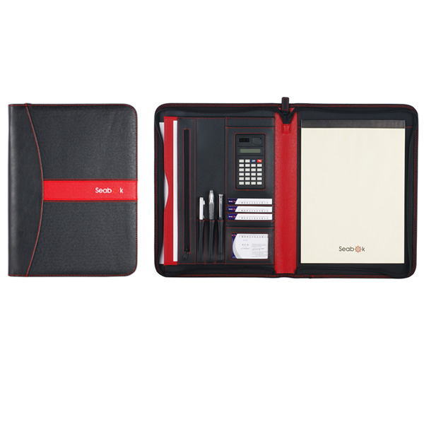 4..Feature: A4- shape Portfolio with file pocket,multi-business card slot,window pocket ,5 "calculator,pen loops and notepad pocket on right inside.zipper closure. |