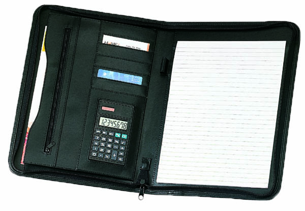 Feature:inner with calculator,document pocket,card pocket ,zipper pocklet,pen loop and A4 standard notepad.