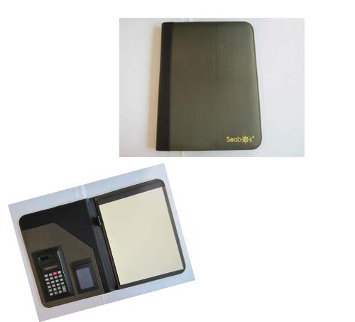 The folder with card holders ,document holders ,calculator holder on the left inside ,pad pocket+pen loop on the right inside .